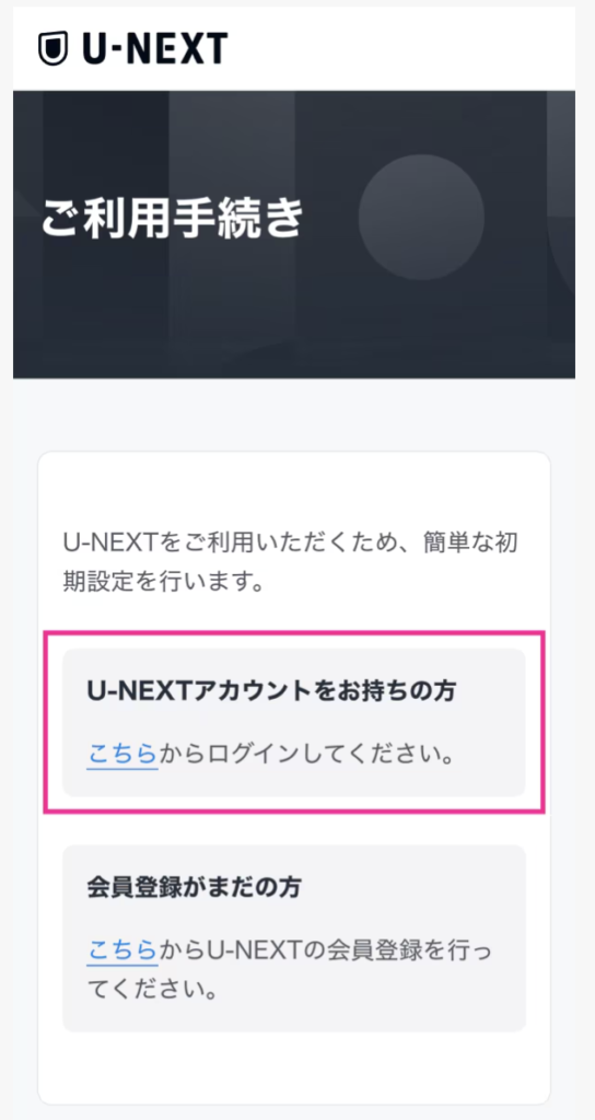 会員登録中に下記の画面で「U-NEXTアカウントをお持ちの方」を選択してください。